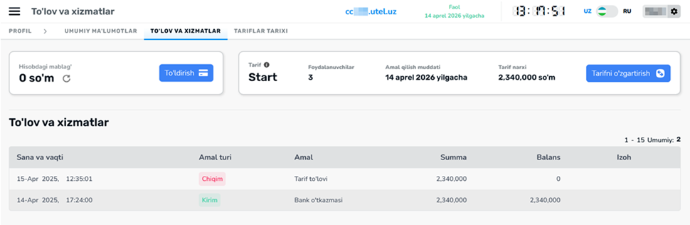 - Profil / To‘lov va xizmatlar bo‘limiga o‘ting.