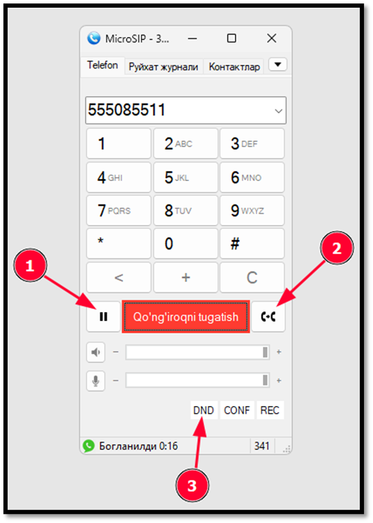 - Eslatma: DND tugmasi yoniq holatda qolib ketmasin, aks holda kiruvchi qo’ng’iroqlarni qabul qilib bo’lmaydi!