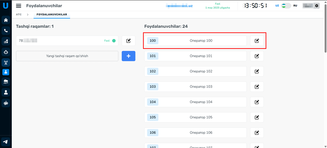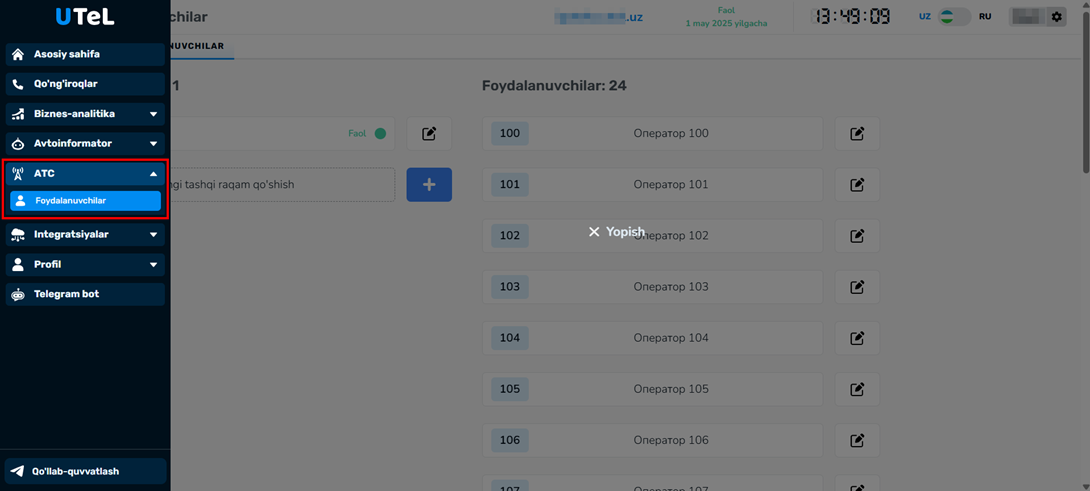 - ATC / Foydalanuvchilar bo‘limiga o‘ting. Bu bo‘limda telefoniyaga ulangan barcha xodimlar ro‘yxati ko‘rsatiladi.