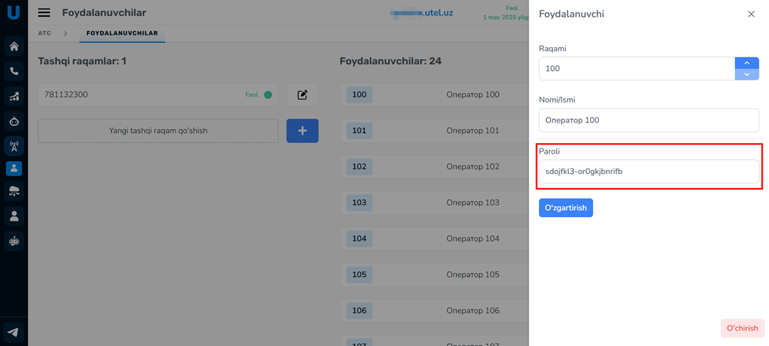 O‘zingiz yoki boshqa xodimga tegishli operator parolini ko‘rish uchun sizda UTeL shaxsiy kabinetiga kirish huquqi bo‘lishi kerak.